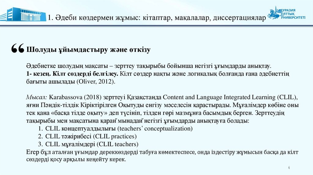 Мысал: Karabassova (2018) зерттеуі Қазақстанда Content and Language Integrated Learning (CLIL),