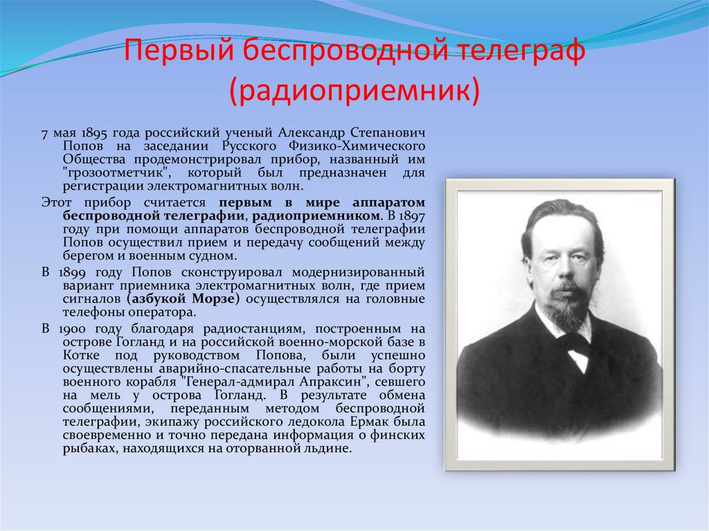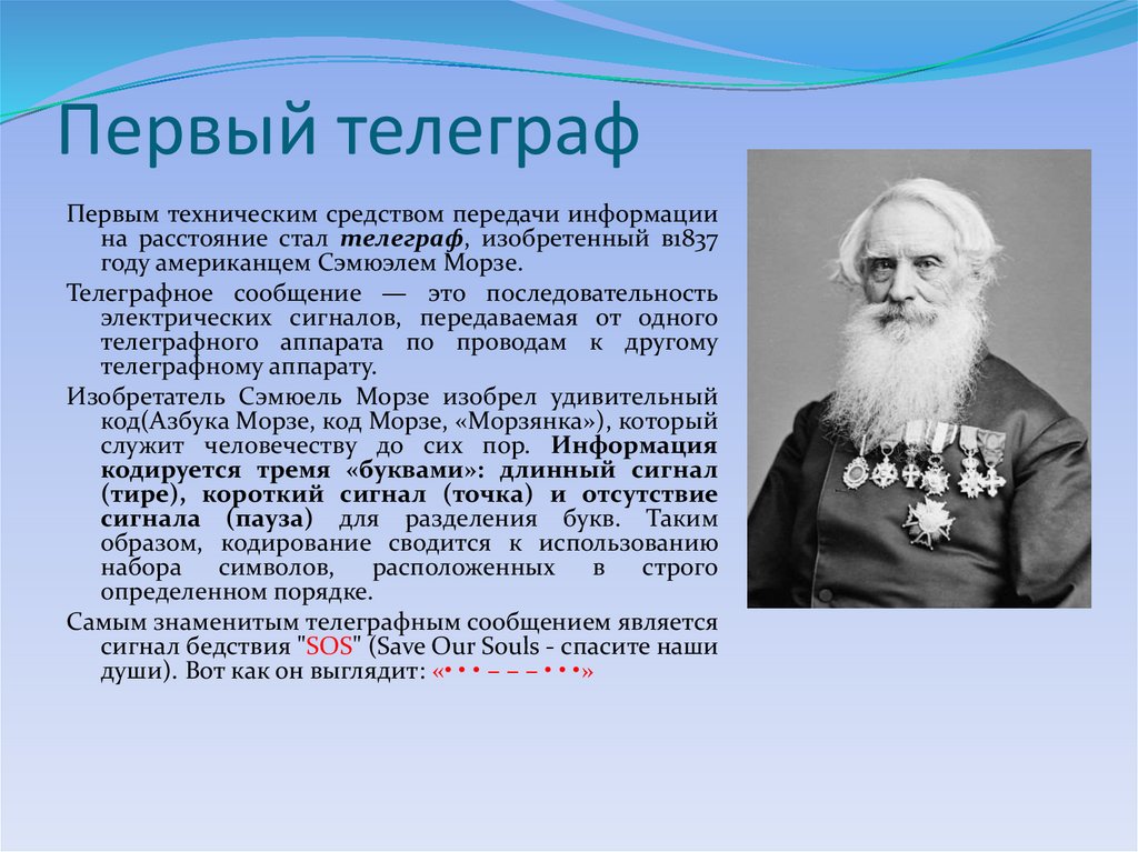 Первым техническим средством передачи информациина расстояние стал телеграф, изобретенный в1837