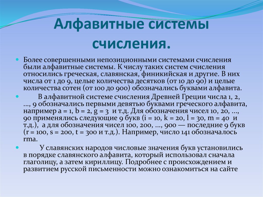 информации. Используя русский алфавит, можно записать число