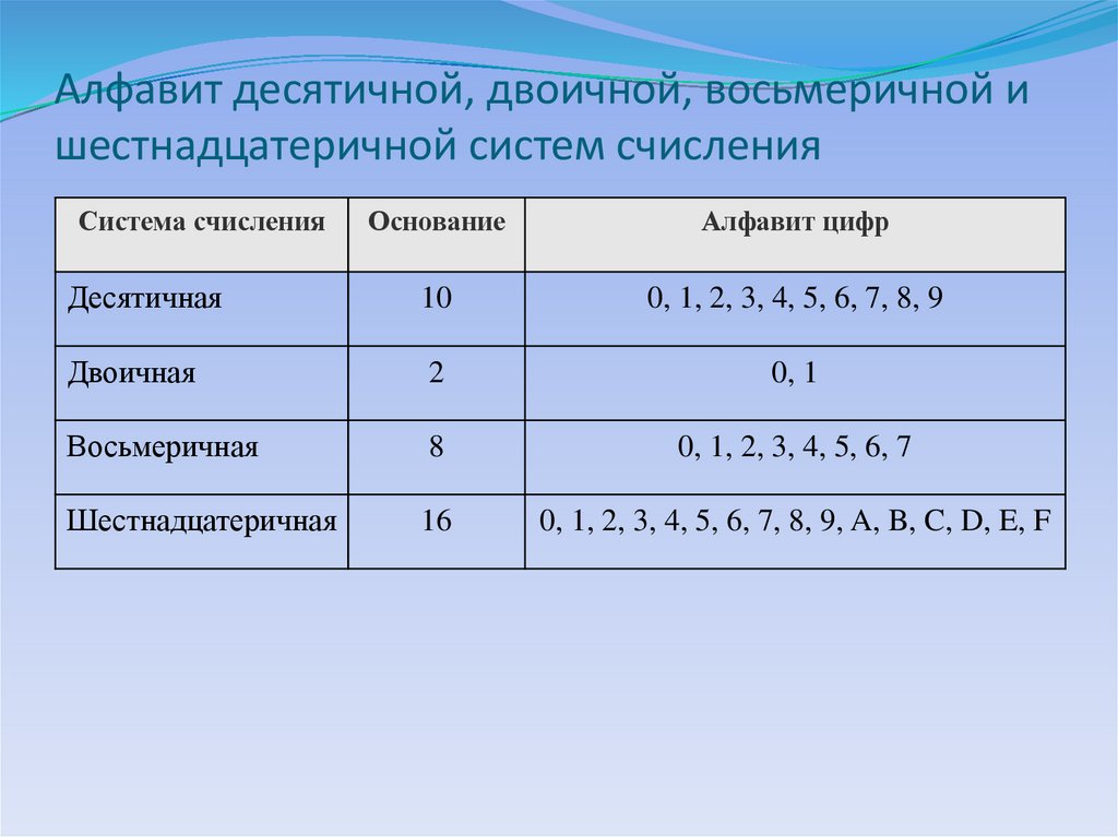 алфавит системы счисления? Примеры.