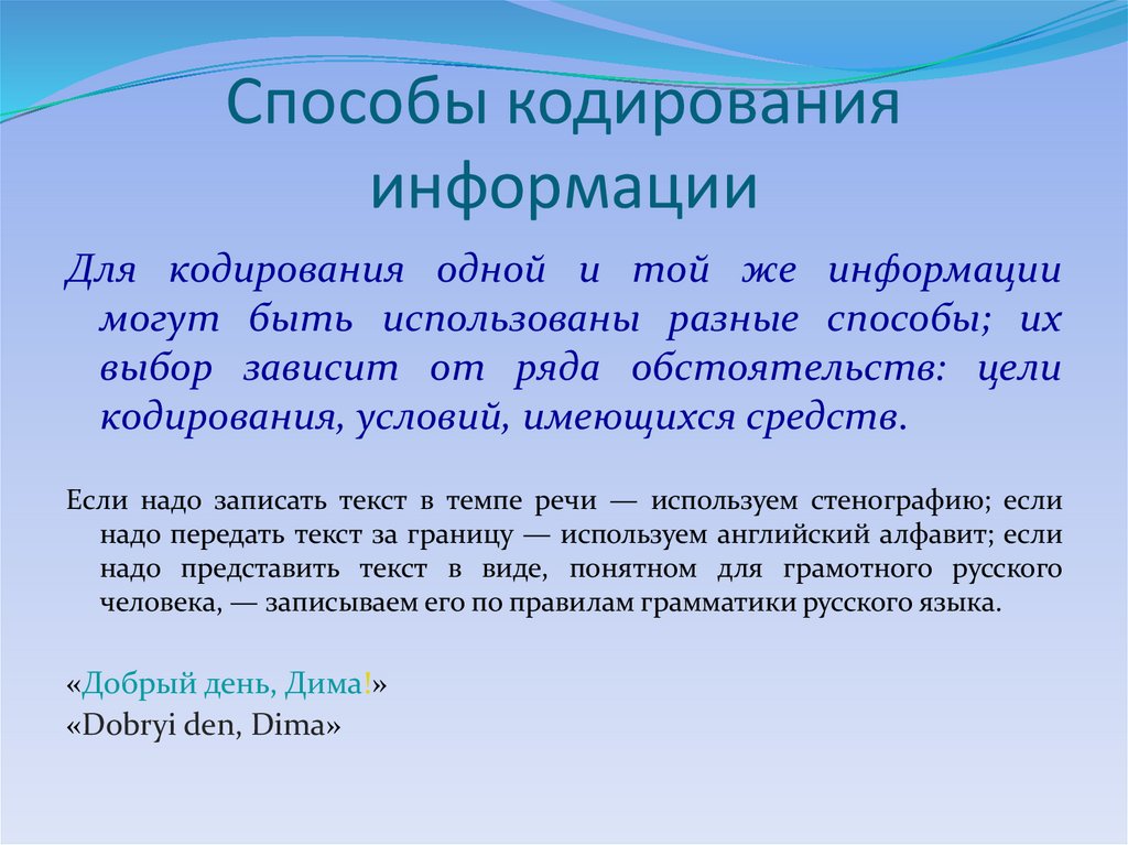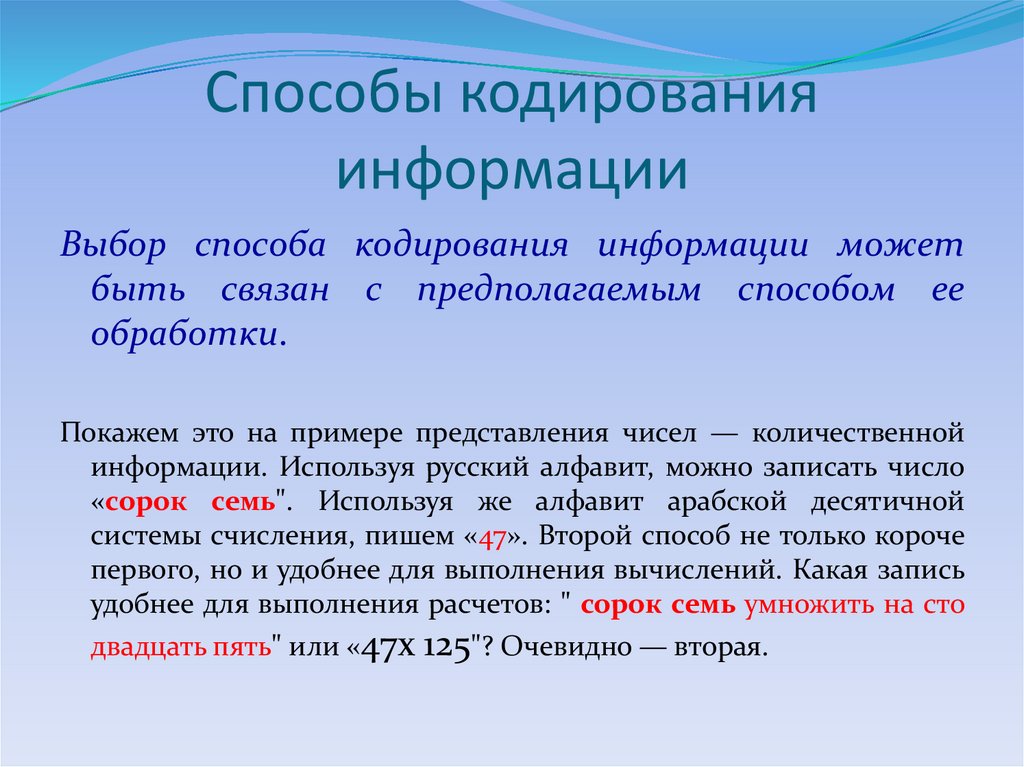 Выбор способа кодирования информации можетбыть связан с предполагаемым способом ее