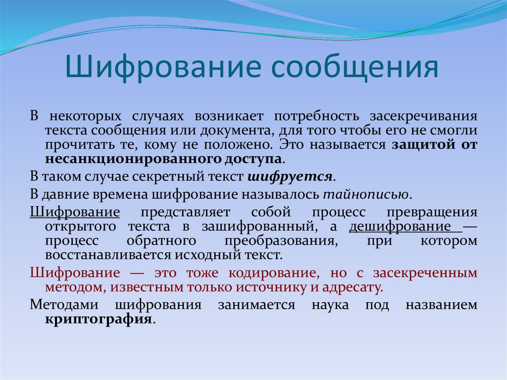 В некоторых случаях возникает потребность засекречиваниятекста сообщения или документа, для того чтобы его не смогли
