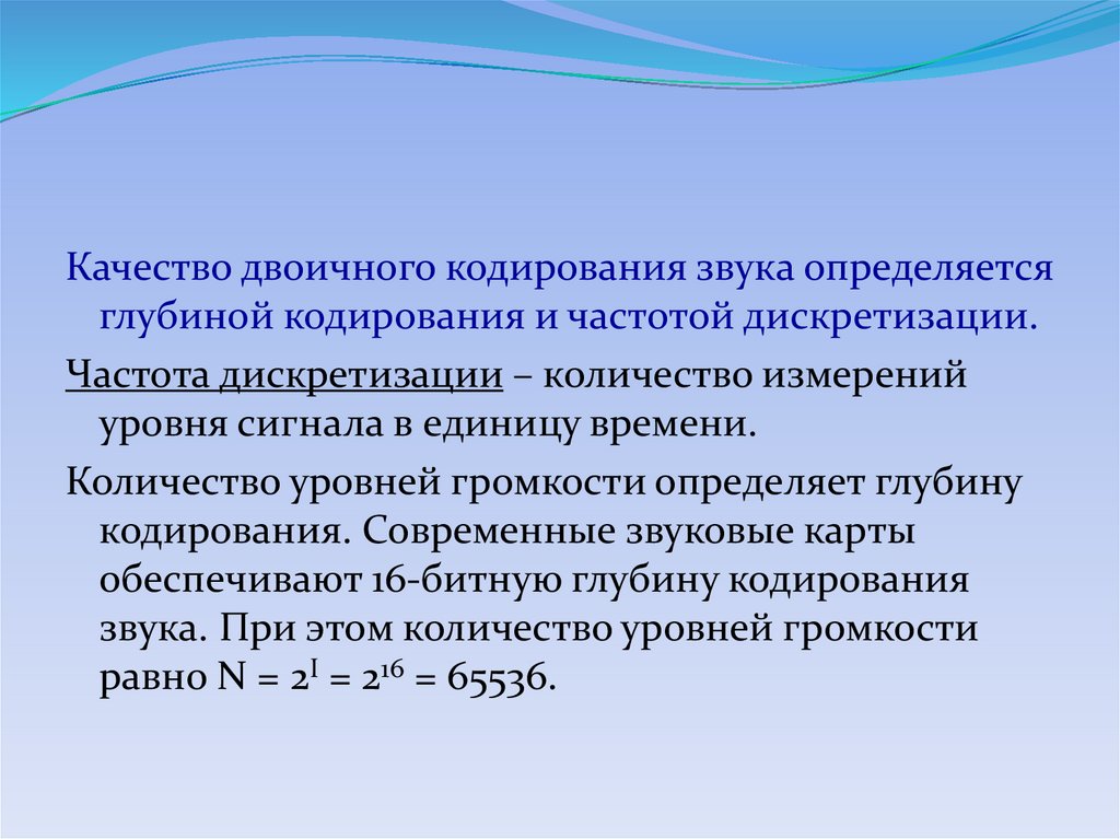 Качество двоичного кодирования звука определяетсяглубиной кодирования и частотой дискретизации.