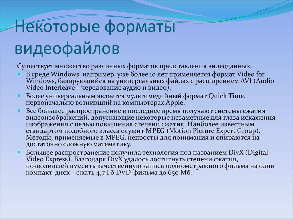 Существует множество различных форматов представления видеоданных.В среде Windows, например, уже более 10 лет применяется формат Video for