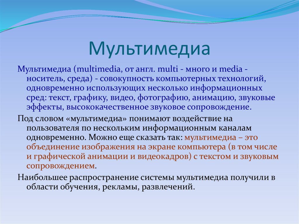 Мультимедиа (multimedia, от англ. multi - много и media носитель, среда) - совокупность компьютерных технологий,одновременно использующих несколько информационных