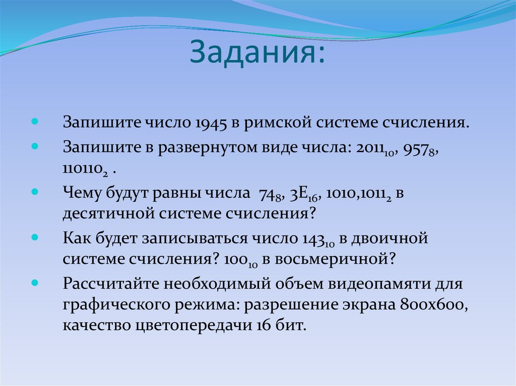 Запишите число 1945 в римской системе счисления.Запишите в развернутом виде числа: 201110, 9578,