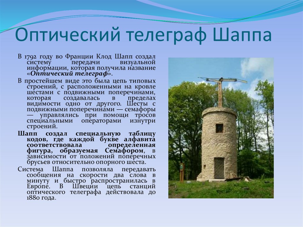 В 1792 году во Франции Клод Шапп создалсистему