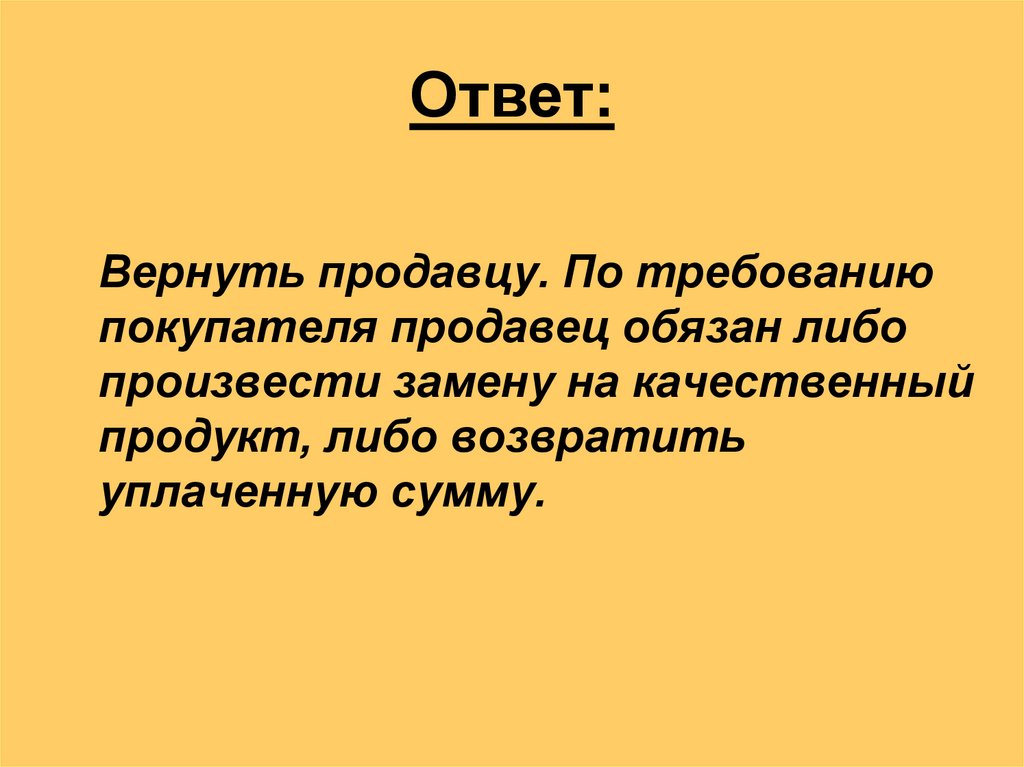 Вернуть продавцу. По требованиюпокупателя продавец обязан либо