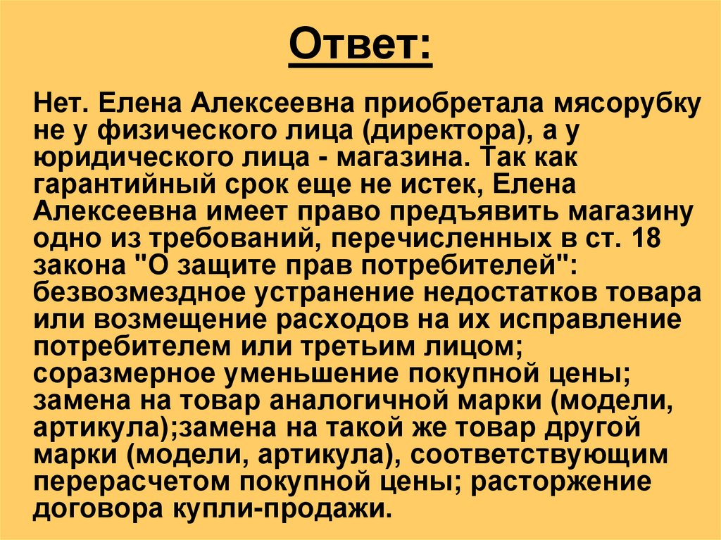 Нет. Елена Алексеевна приобретала мясорубкуне у физического лица (директора), а у