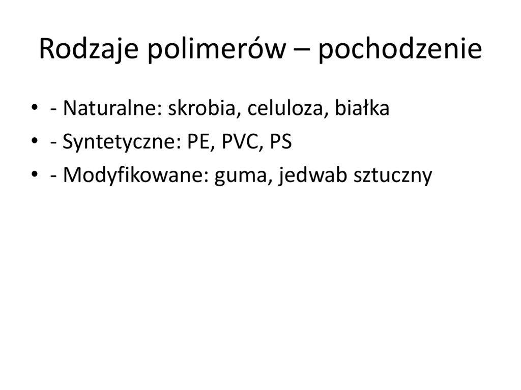 Rodzaje polimerów – pochodzenie• - Naturalne: skrobia, celuloza, białka