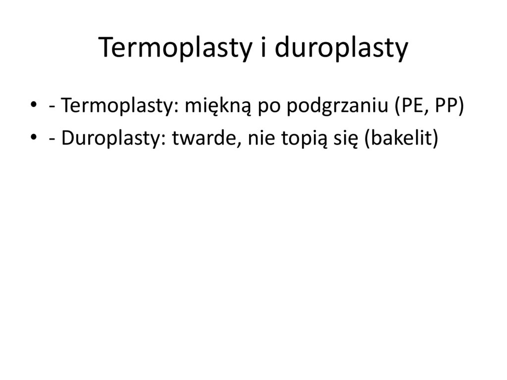 Termoplasty i duroplasty• - Termoplasty: miękną po podgrzaniu (PE, PP)