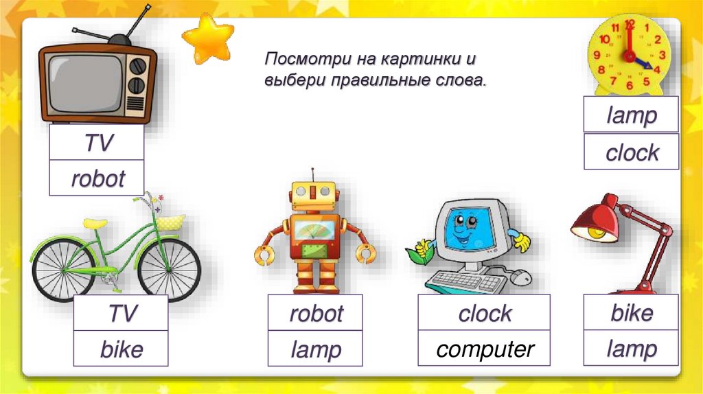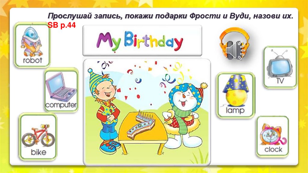 Прослушай запись, покажи подарки Фрости и Вуди, назови их.SB p.44