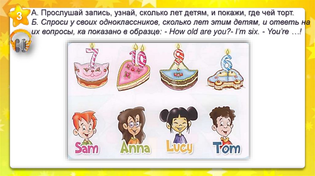 3А. Прослушай запись, узнай, сколько лет детям, и покажи, где чей торт.