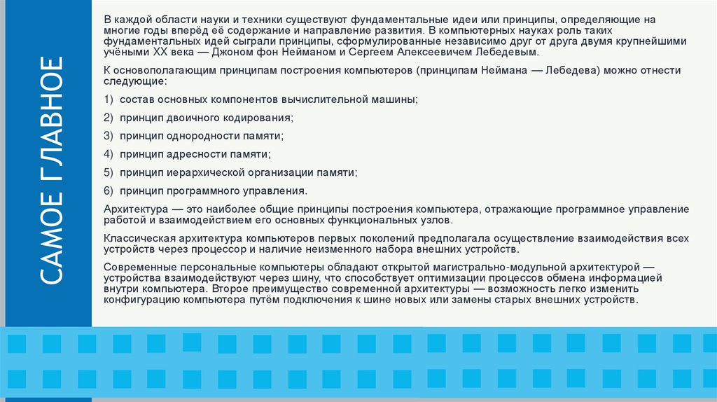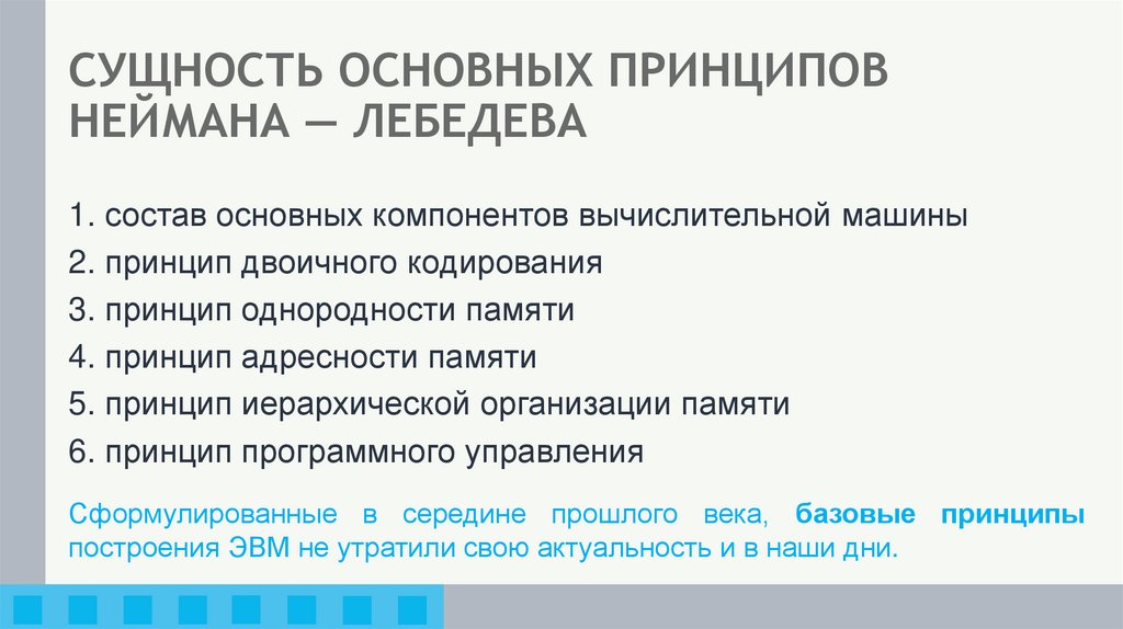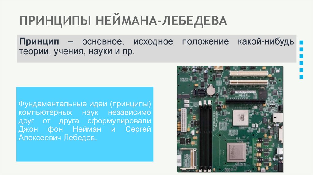 К основополагающим принципам построения компьютеров (принципам Неймана — Лебедева) можно отнести