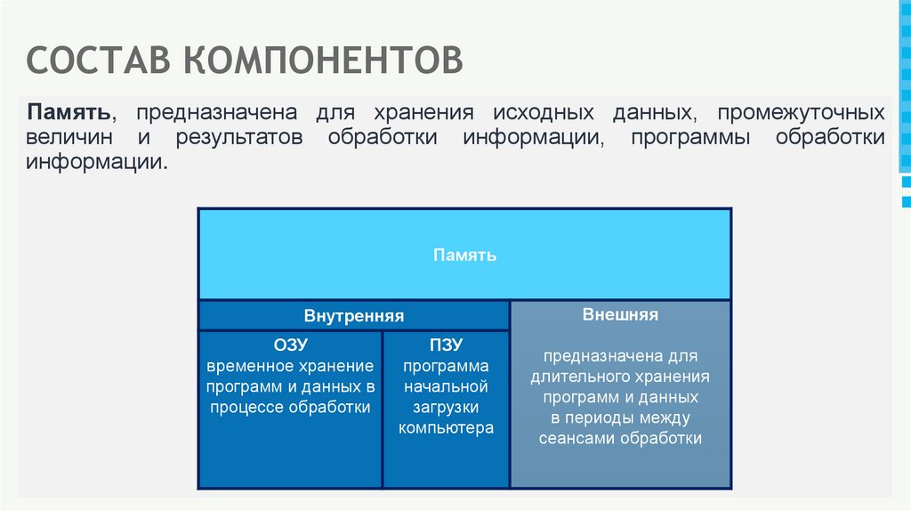 Память, предназначена для хранения исходных данных, промежуточныхвеличин и результатов обработки информации, программы обработки