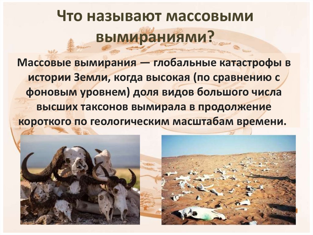 Массовые вымирания — глобальные катастрофы вистории Земли, когда высокая (по сравнению с
