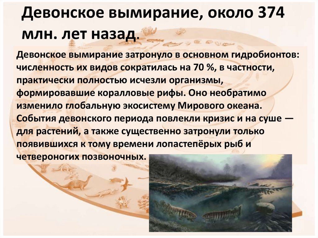 Девонское вымирание затронуло в основном гидробионтов:численность их видов сократилась на 70 %, в частности,