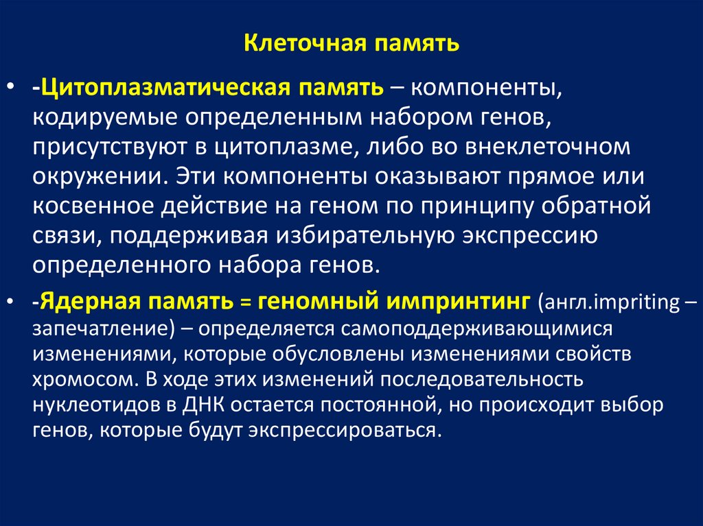 • -Цитоплазматическая память – компоненты,кодируемые определенным набором генов,