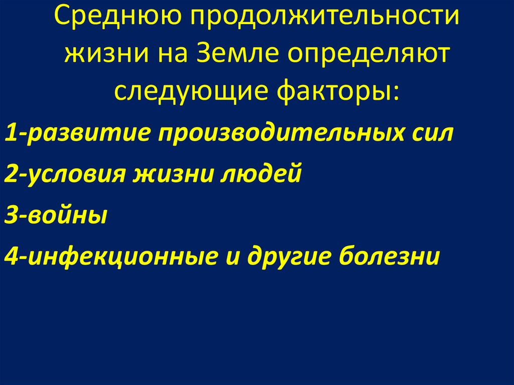 65. Среднюю продолжительности жизни на Земле определяют следующие факторы: