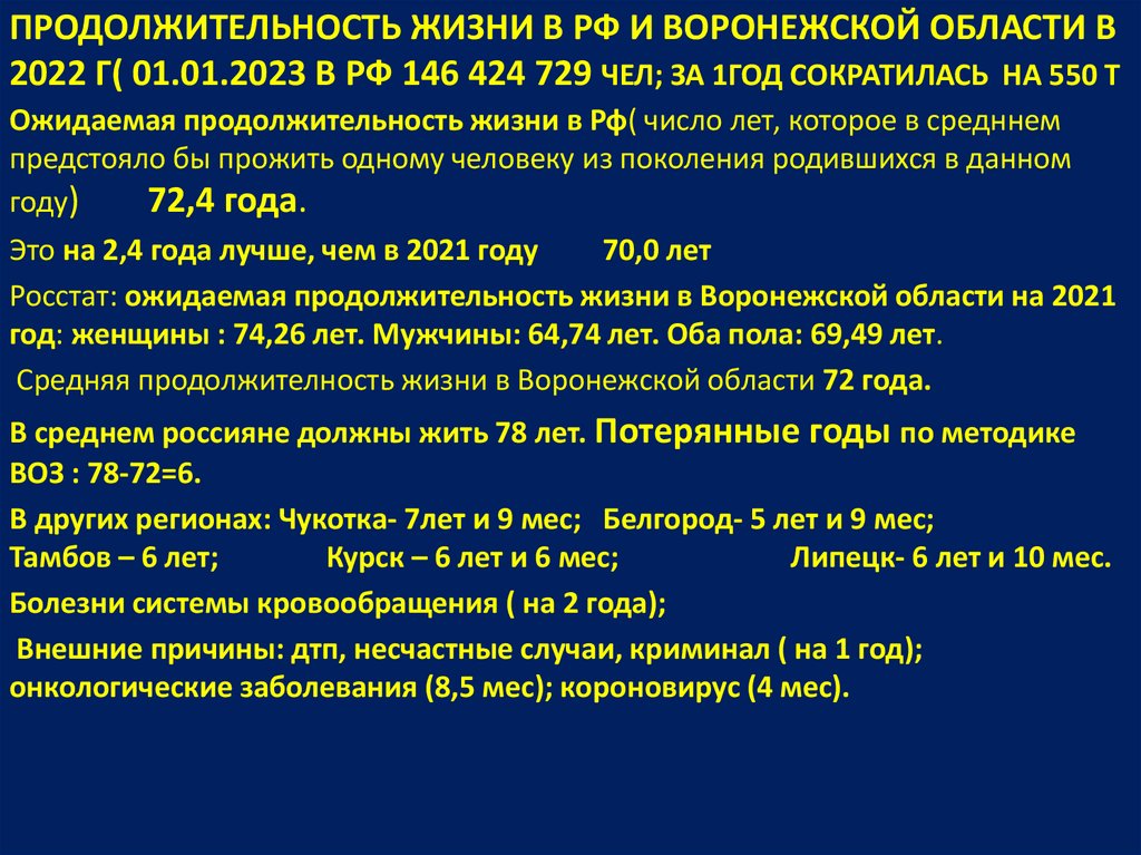 ПРОДОЛЖИТЕЛЬНОСТЬ ЖИЗНИ В РФ И ВОРОНЕЖСКОЙ ОБЛАСТИ В2022 Г( 01.01.2023 В РФ 146 424 729 ЧЕЛ; ЗА 1ГОД СОКРАТИЛАСЬ НА 550 Т