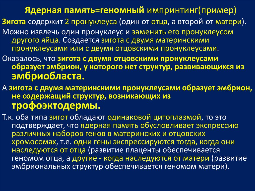 • -Ядерная память = геномный импринтинг (англ.impriting –