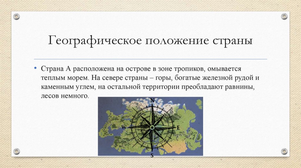 • Страна А расположена на острове в зоне тропиков, омываетсятеплым морем. На севере страны – горы, богатые железной рудой и