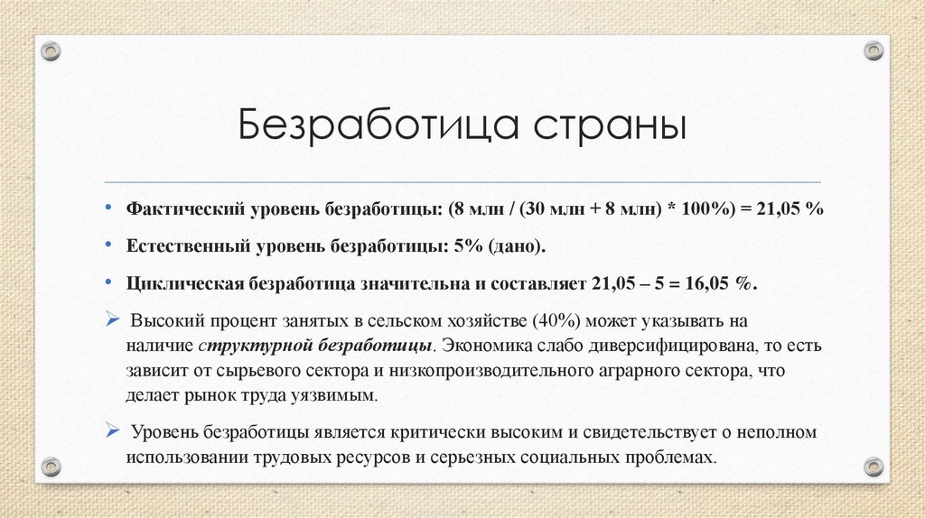 • Фактический уровень безработицы: (8 млн / (30 млн + 8 млн) * 100%) = 21,05 %• Естественный уровень безработицы: 5% (дано).