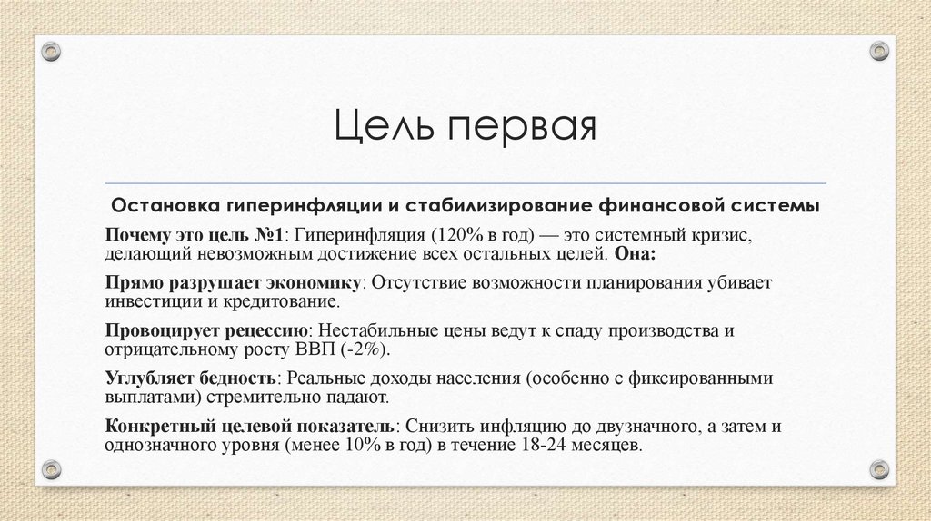 Остановка гиперинфляции и стабилизирование финансовой системыПочему это цель №1: Гиперинфляция (120% в год) — это системный кризис,