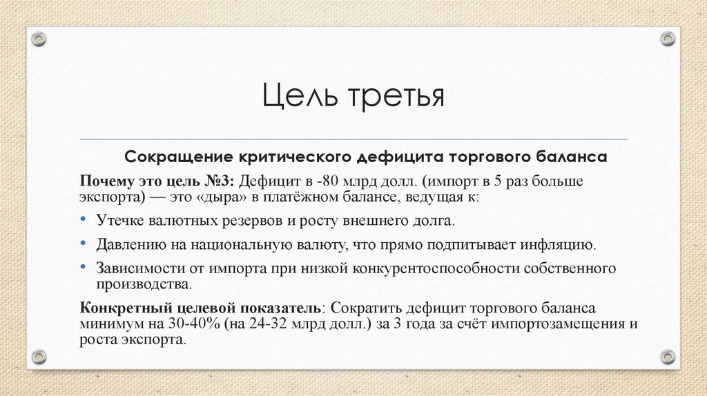 Конкретный целевой показатель: Сократить дефицит торгового баланса