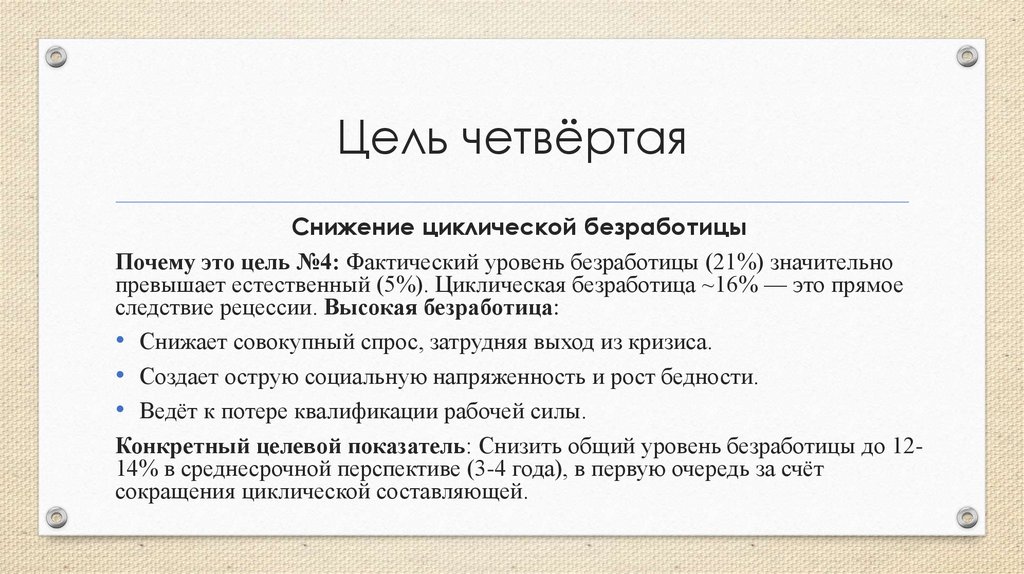 Снижение циклической безработицыПочему это цель №4: Фактический уровень безработицы (21%) значительно