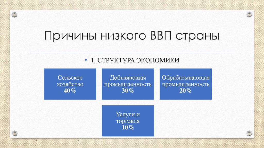 коренная причина низкого ВВП на душу населения (3214 долл.) и уязвимости к