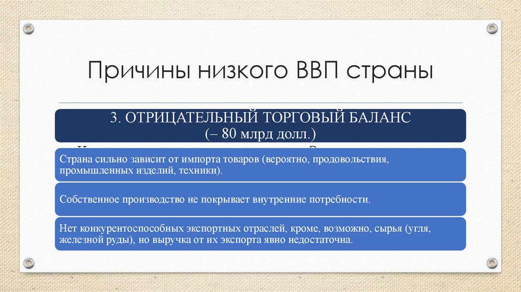 Причины дефицита• Экспорт состоит из железной руды, угля и сельхозпродукции. Эти товары имеют