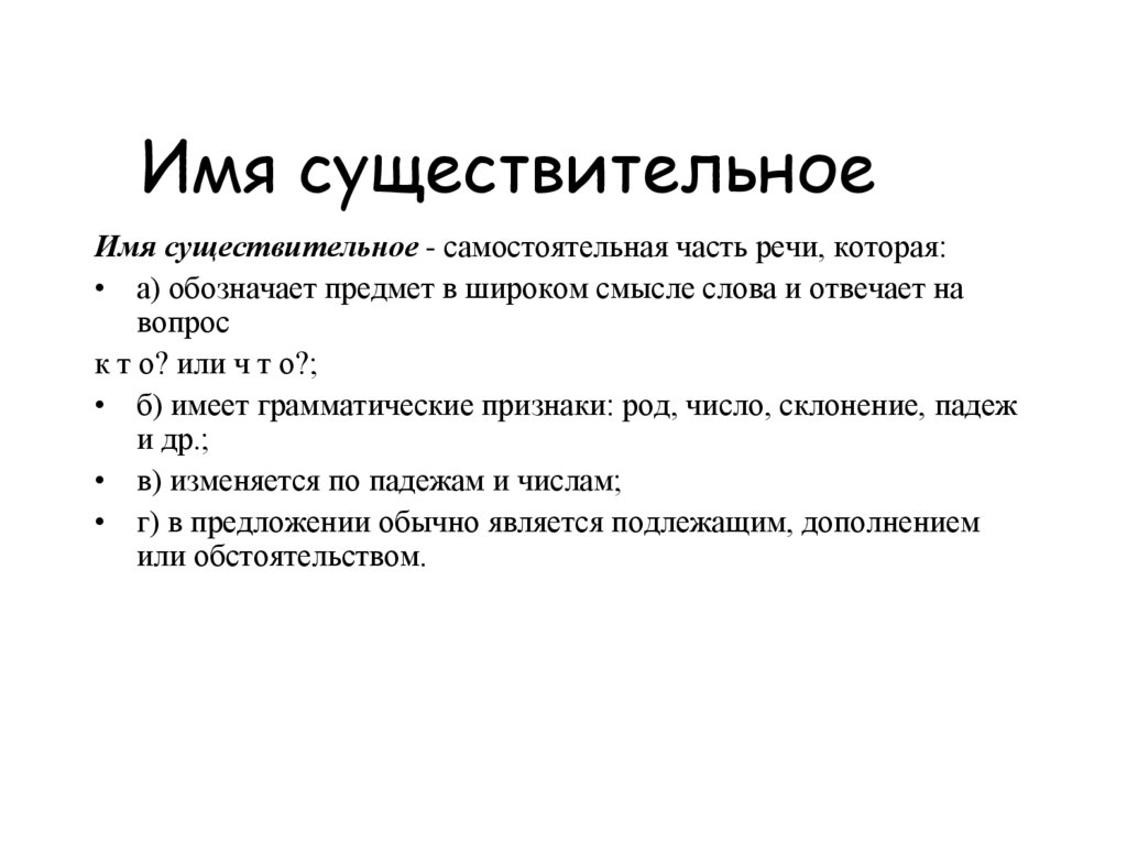• г) в предложении обычно является подлежащим, дополнением