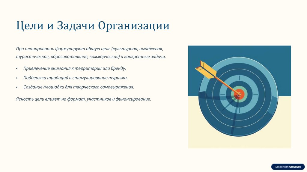 Цели и Задачи ОрганизацииПри планировании формулируют общую цель (культурная, имиджевая,