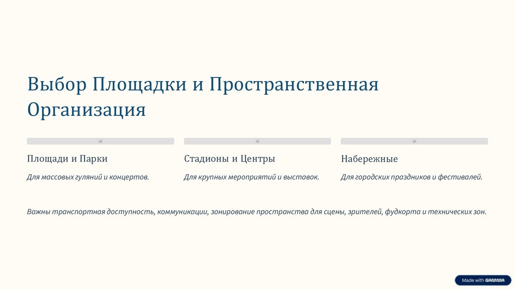 Важны транспортная доступность, коммуникации, зонирование пространства для сцены, зрителей, фудкорта и технических зон.