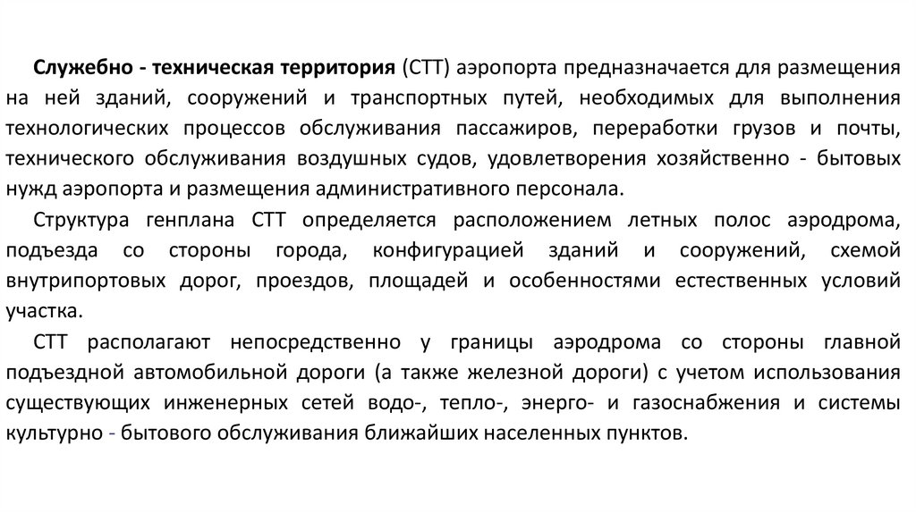 Служебно - техническая территория (СТТ) аэропорта предназначается для размещенияна ней зданий, сооружений и транспортных путей, необходимых для выполнения