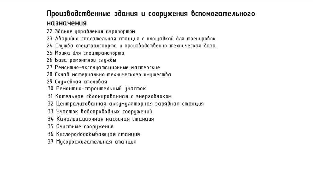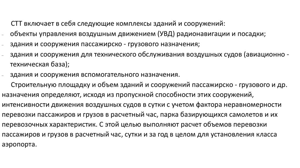СТТ включает в себя следующие комплексы зданий и сооружений:объекты управления воздушным движением (УВД) радионавигации и посадки;