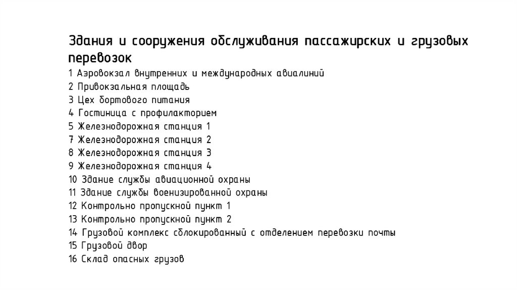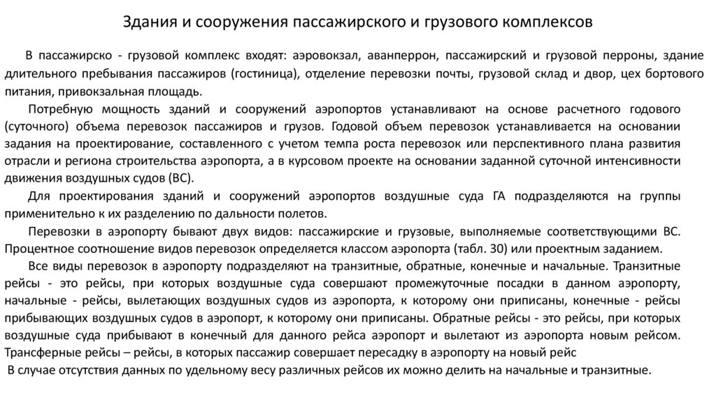 Здания и сооружения пассажирского и грузового комплексовВ пассажирско - грузовой комплекс входят: аэровокзал, аванперрон, пассажирский и грузовой перроны, здание