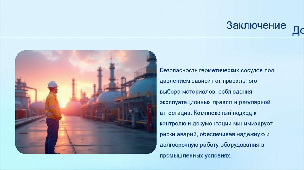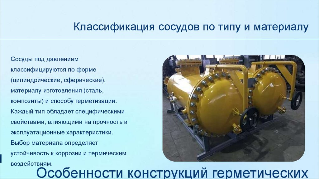 В данной презентации рассматриваются основные виды сосудов, работающих поддавлением, с особенностями их конструкций и материалами. Особое внимание