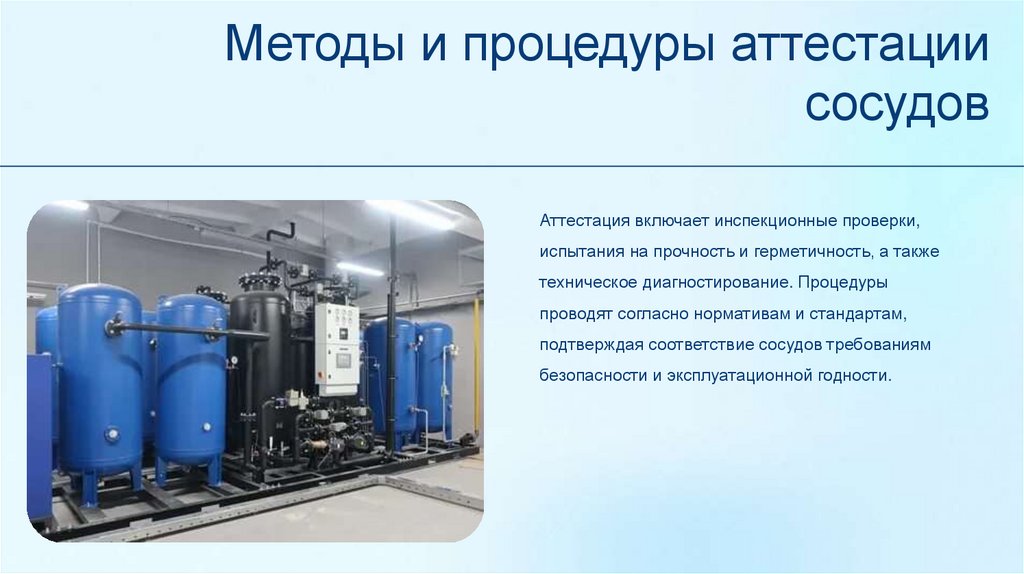 Аттестация включает инспекционные проверки,испытания на прочность и герметичность, а также