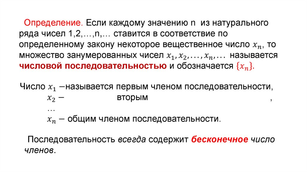 Определение. Если каждому значению n из натуральногоряда чисел 1,2,…,n,… ставится в соответствие по