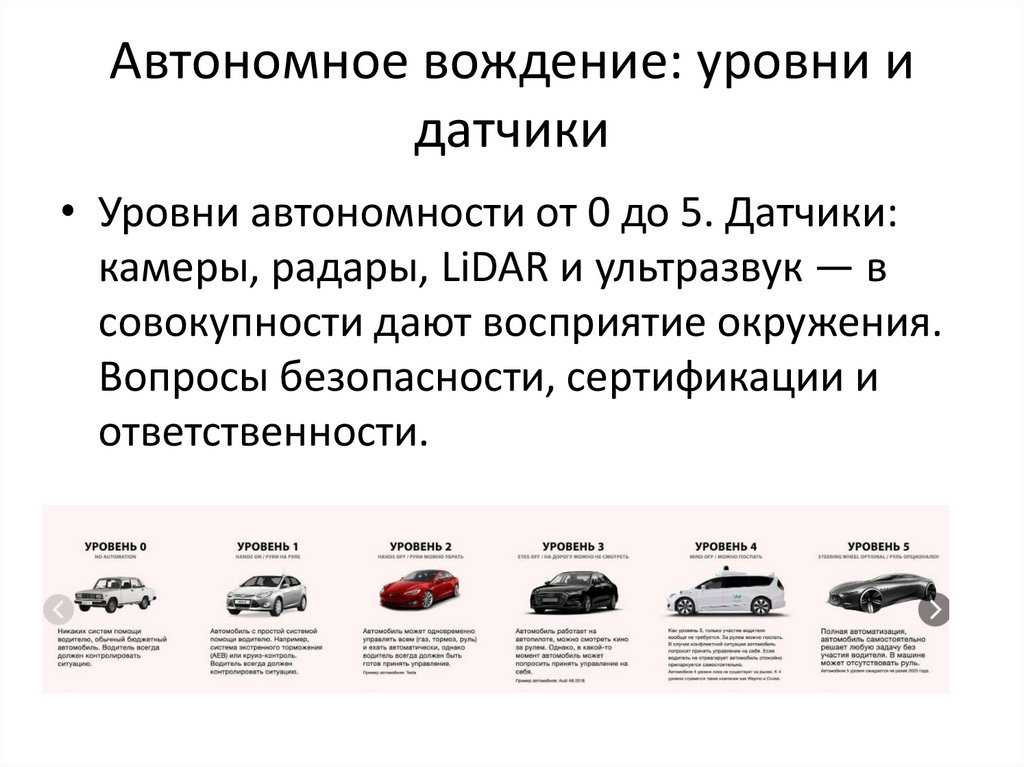 • Уровни автономности от 0 до 5. Датчики:камеры, радары, LiDAR и ультразвук — в