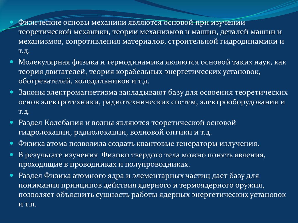 Физические основы механики являются основой при изучениитеоретической механики, теории механизмов и машин, деталей машин и