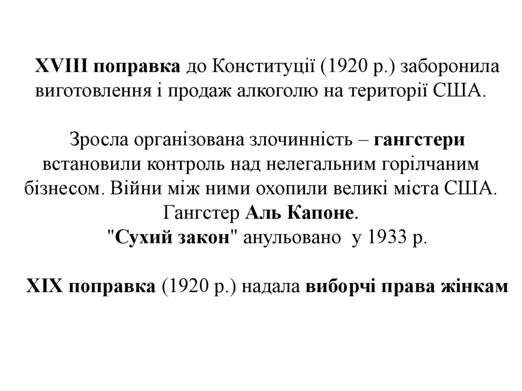 XVIII поправка до Конституції (1920 р.) заборонилавиготовлення і продаж алкоголю на території США.