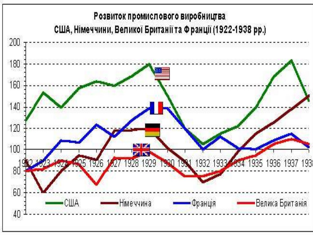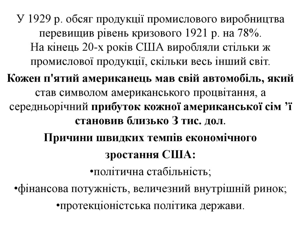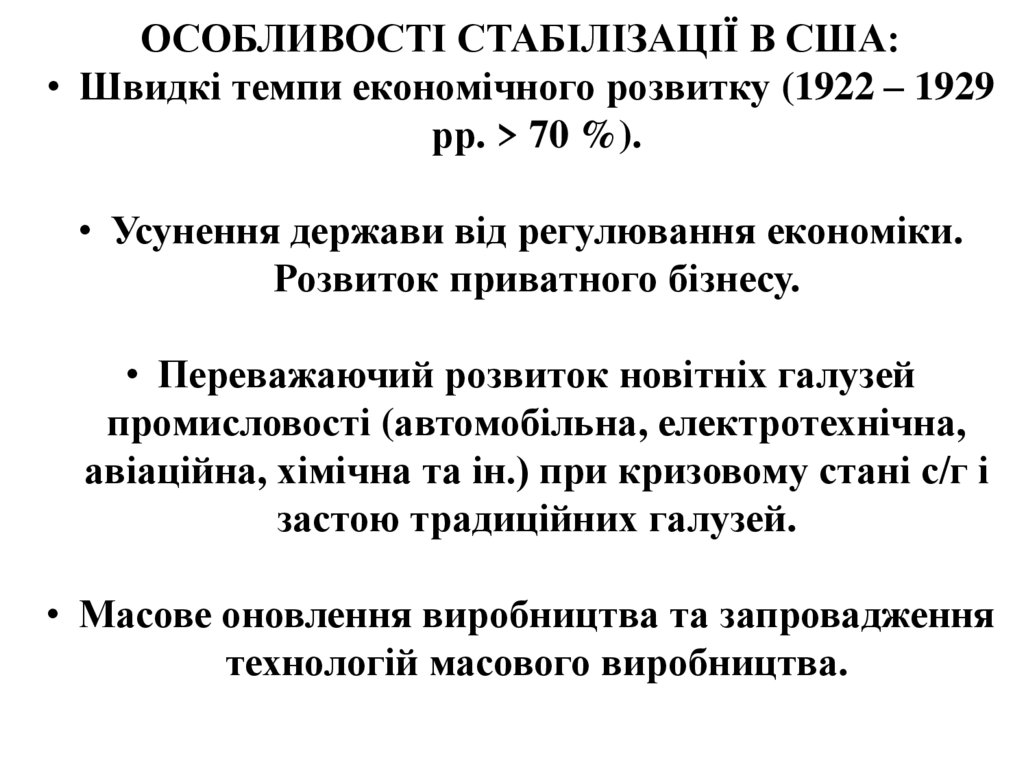 ОСОБЛИВОСТІ СТАБІЛІЗАЦІЇ В США:• Швидкі темпи економічного розвитку (1922 – 1929