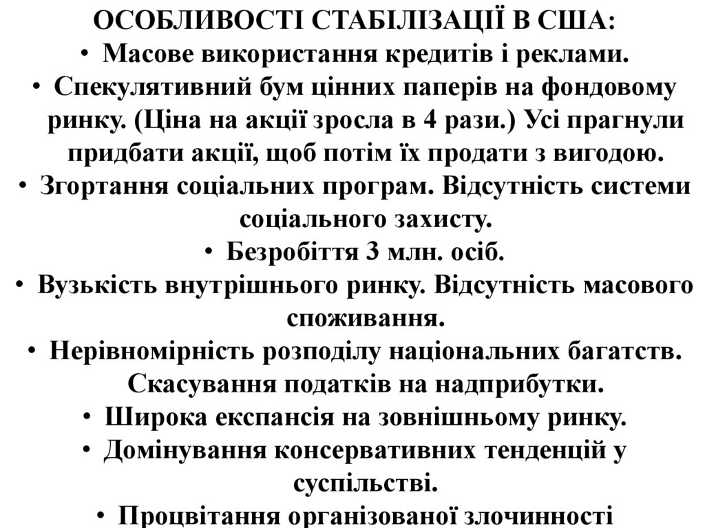 ОСОБЛИВОСТІ СТАБІЛІЗАЦІЇ В США:• Масове використання кредитів і реклами.