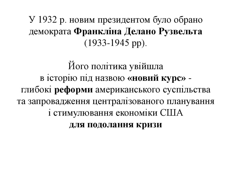 У 1932 р. новим президентом було обранодемократа Франкліна Делано Рузвельта