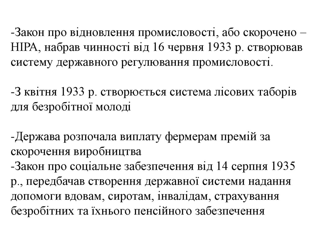 -Закон про відновлення промисловості, або скорочено –НІРА, набрав чинності від 16 червня 1933 р. створював