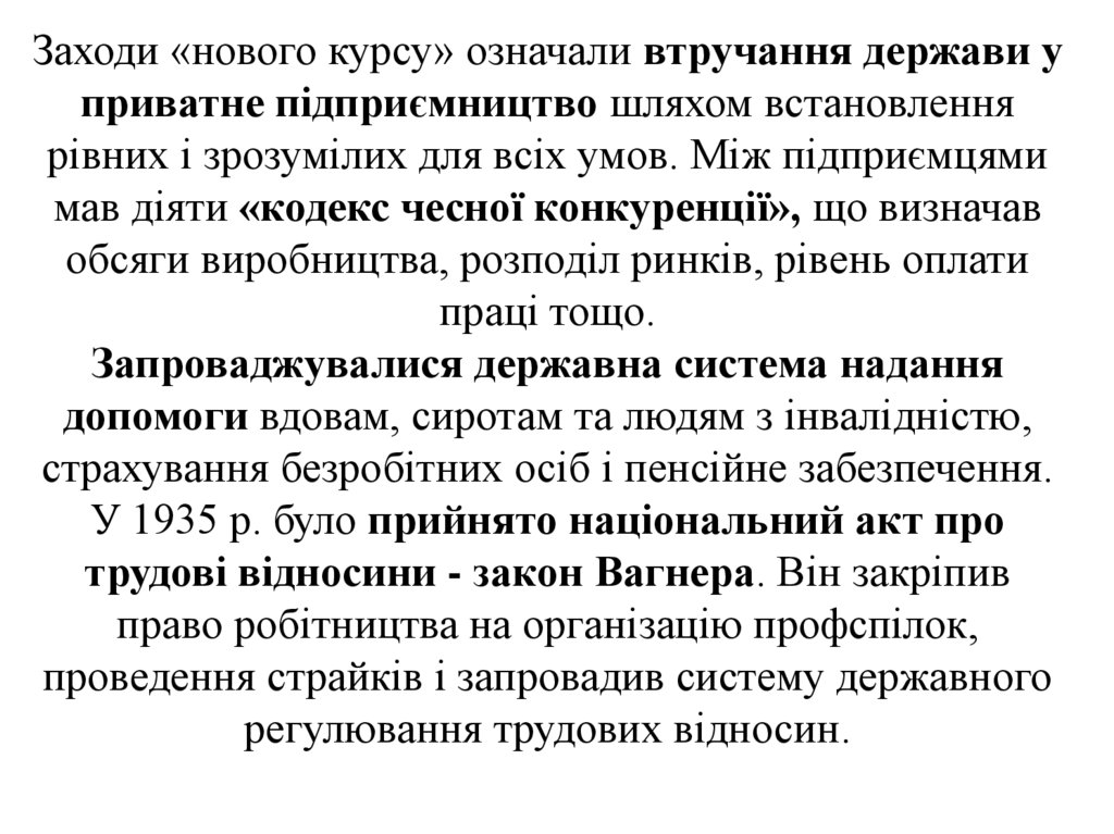 Заходи «нового курсу» означали втручання держави уприватне підприємництво шляхом встановлення