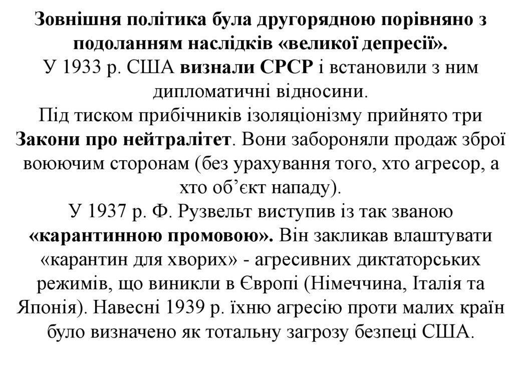 Зовнішня політика була другорядною порівняно зподоланням наслідків «великої депресії».